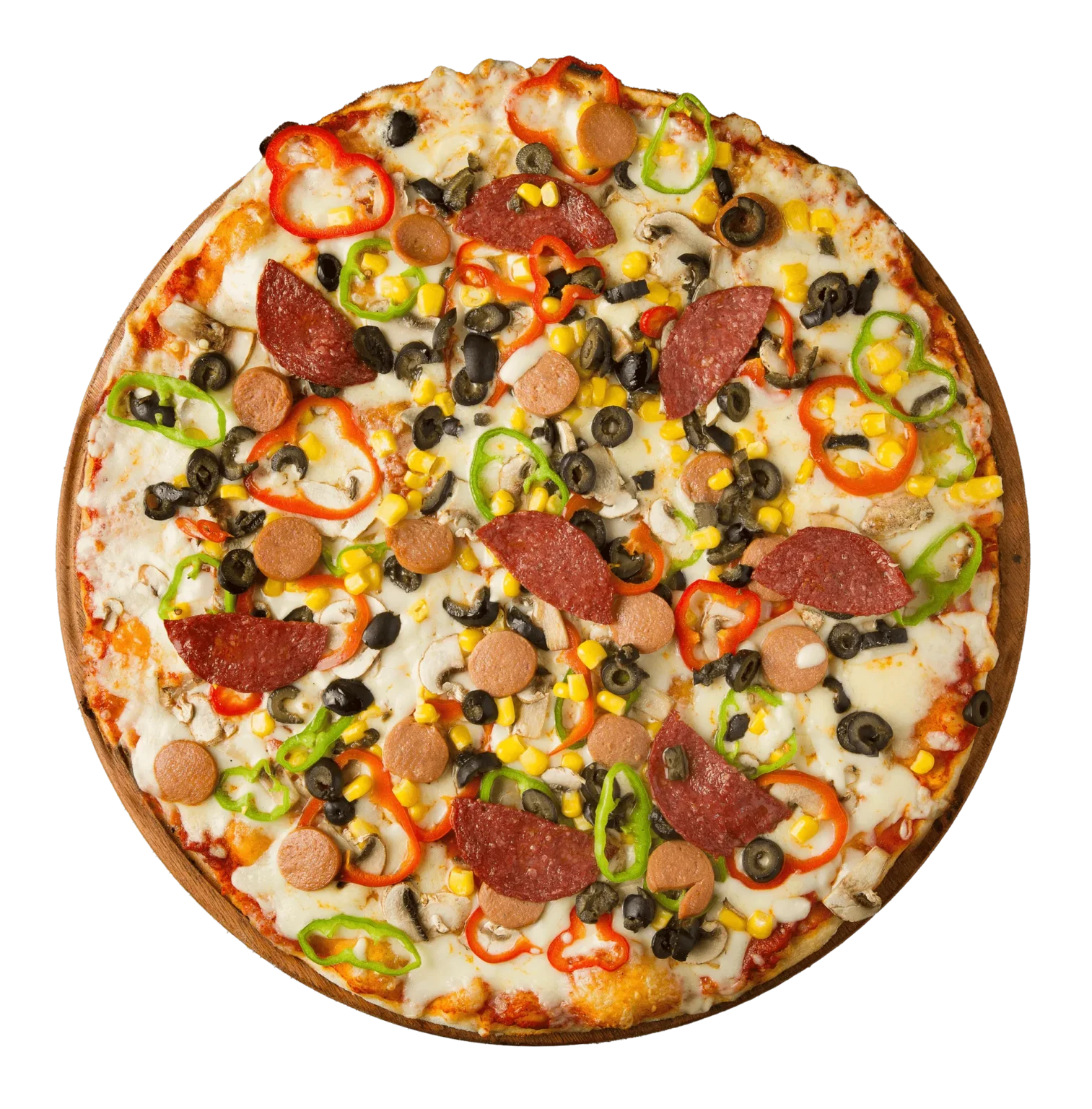 TAZE PİZZA SOSU / MOZZARELLA / KASAP SUCUK / FÜME SOSİS / MANTAR / KAPYA VE YEŞİL BIBER / ZEYTİN / MISIR